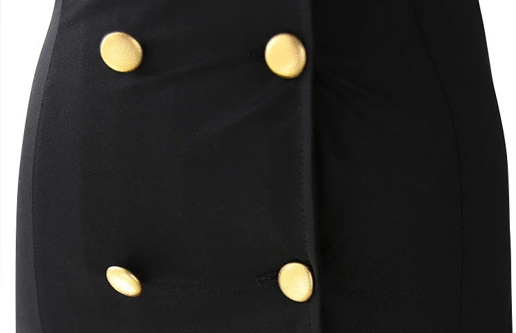 Sa robe noire ajustée à double boutonnage épouse parfaitement les courbes, dessinant une silhouette élégante… mais terriblement provocante. Le chapeau, le foulard et les détails dorés viennent renforcer ce style autoritaire et irrésistible, entre élégance professionnelle et fantasme assumé.